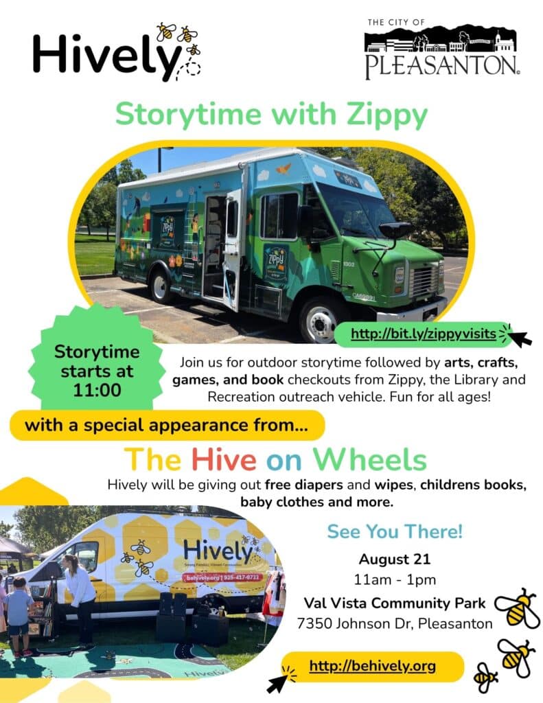 The Hive on Wheels will make a joint appearance with Zippy the Bookmobile. Kids of all ages are invited to check out books from the mobile library and participate in crafts and activities. Storytime is most suitable for toddlers.